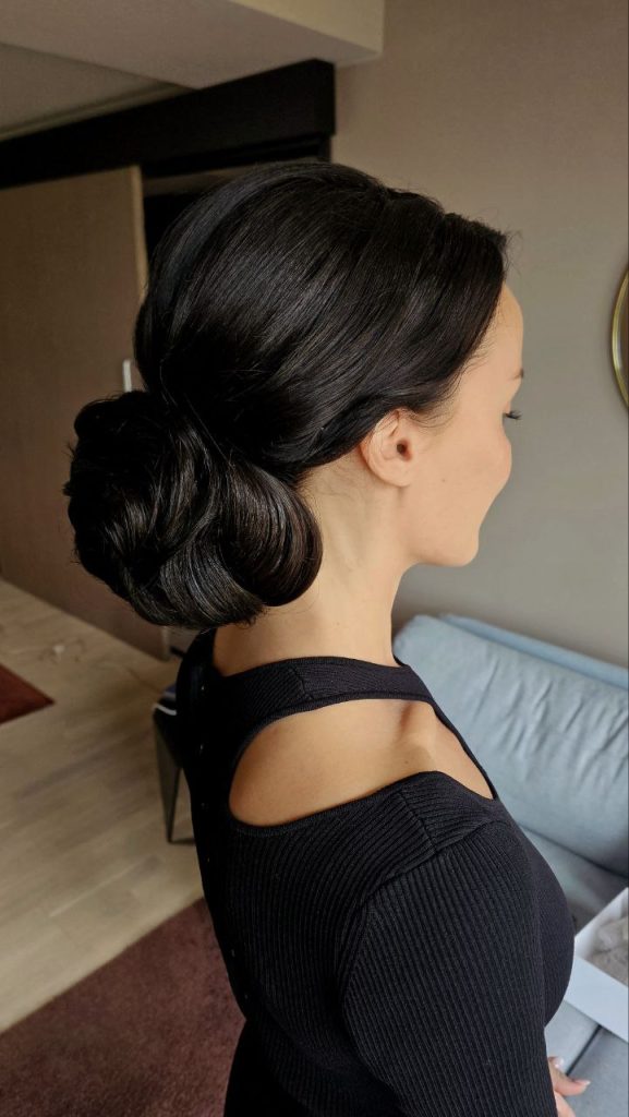 - A low classic bun with a structured crown shape and a voluminous bun body.